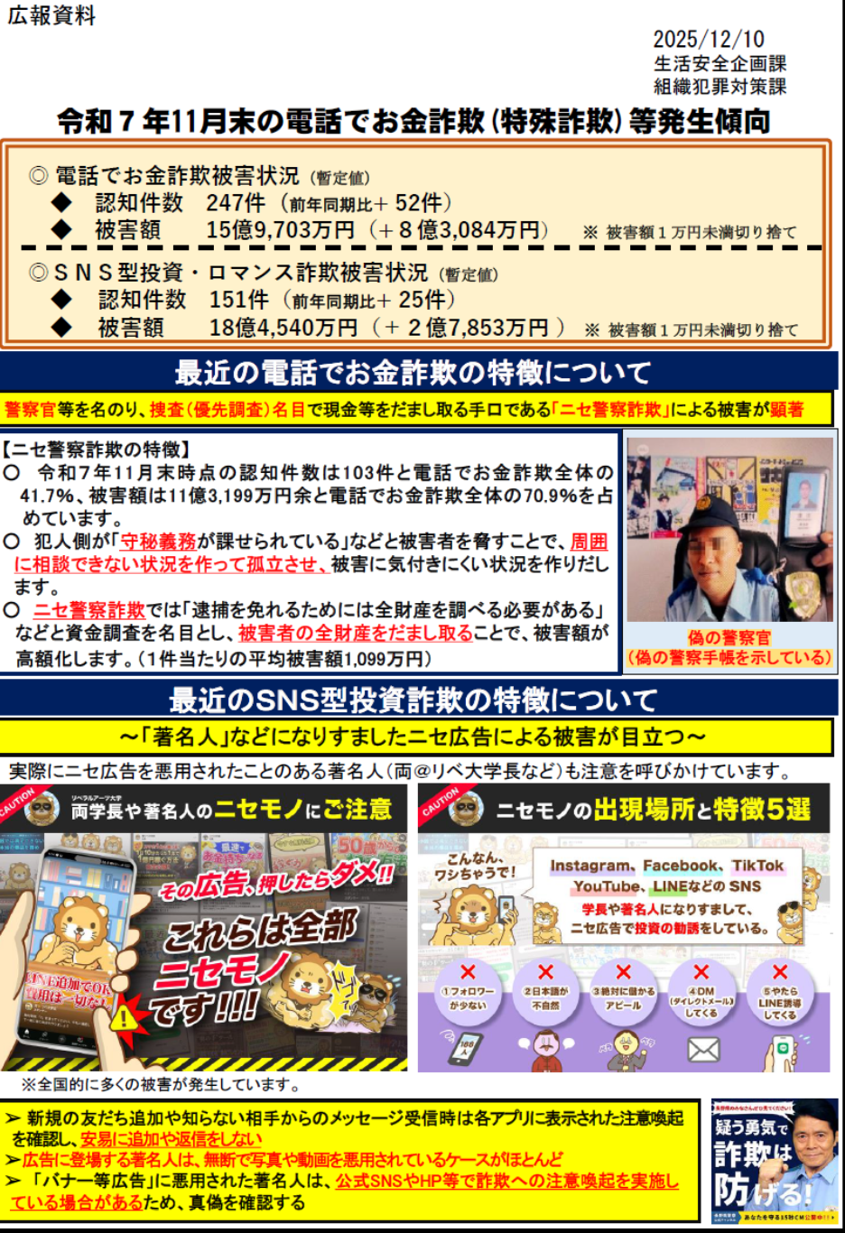 2025.12.16 防犯組合連合会お知らせ 令和7年11月末の電話でお金詐欺(特殊詐欺)被害認知件数等を更新しました。 「電話でお金詐欺(特殊詐欺)」被害状況(R7.11末暫定値) ◇ 被害件数247件(前年同...